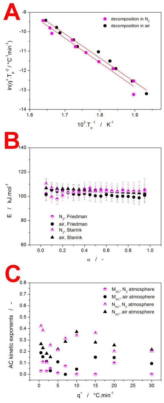 - Starink, M.J. The determination of activation energy from linear heating rate experiments: A comparison of the accuracy of isoconversion methods. Thermochim. Acta 2003, 404, 163–176. [Google Scholar] [CrossRef]