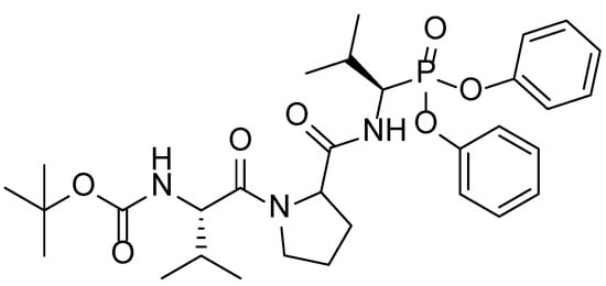 The development of CtHtrA inhibitors has produced diphenylphosphonate peptide-based inhibitors such as JO146 (Figure 1). JO146 features a tripeptidomimetic backbone with a terminal N-Boc capping group and an electrophilic diphenylphosphonate headgroup that reacts with the serine protease to form a reversible covalent complex with CtHtrA (IC50 = 12 µM) [9]. JO146 exhibits anti-chlamydial properties against C. trachomatis and other chlamydial species with minimal cytotoxic properties against mammalian cell lines including HEp-2 cells, McCoy B cells and ex vivo Koala mononuclear blood cells [9]. Similar structures with modifications to the N-terminal capping group retain their anti-chlamydial activity [10]. However, their inhibitory activity against CtHtrA has not been investigated.