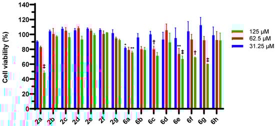 Cytotoxicity of 2a–g and 6a–h against HEp-2 cells (24 h, 31.25 µM, 62.5 µM and 125 µM). Values represent the average ± SEM from three independent experiments. Significance shown is relative to solvent (0.1% DMSO) controls: (*) p ≤ 0.05, (**) p ≤ 0.01, (†) p ≤ 0.005, (‡) p ≤ 0.001.
