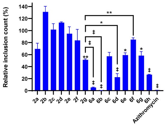 Inhibition of 2a–g and 6a–h against C. trachomatis (30 h post infection, 62.5 µM). Azithromycin positive control was used at 0.5 µg/mL. Values represent the average ± SEM from three independent experiments. Significance shown is relative to solvent (0.1% DMSO) controls: (*) p ≤ 0.05, (**) p ≤ 0.01, (‡) p ≤ 0.001.