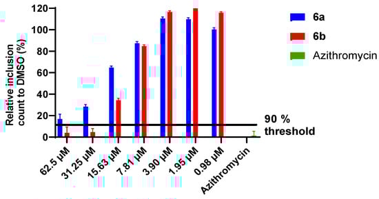 Compounds 6a and 6b were further investigated as they exhibited the most activity against C. trachomatis at 62.5 µM. In anti-chlamydial assays, the MIC (minimum inhibitory concentration) of a compound is defined as twice the MICTP (the MIC transition point), which is the concentration required to alter >90% chlamydial morphology (i.e., a reduction in size) [27]. For 6a and 6b, dose–response relationships for their anti-chlamydial activity were identified (Figure 5). However, 6a did not consistently show inhibition greater than the 90% threshold at any concentration tested. Compound 6b showed greater than 90% inhibition at concentrations ≥ 31.25 µM. These results show that while both 6a and 6b exhibit dose–response relationships against the inhibition of C. trachomatis growth, only compound 6b has a calculable MIC of 62.5 µM, as per the reported definition [27].