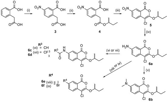 We sought to investigate the structure–activity relationship between the inhibitory properties of C-7-substituted 4-chloroisocoumarins against CtHtrA. The scope of functional groups that have been introduced at this position is limited; the current literature reports only nitrogen-based substituents [18,19,20,21]. Thus, we developed new chemistry to expand the scope of functional groups that could be introduced at this position. Based on the protease inhibition activity of 2g (vide infra) against CtHtrA, we used this compound as a template scaffold to synthesize a range of C-7-substituted (±)-3-sec-butoxy-4-chloroisocoumarin compounds (Figure 2), as shown in Scheme 2.