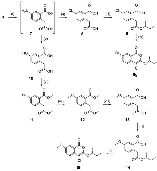 Chloro- and methoxy-analogues (6g and 6h, respectively) were synthesized using the procedure shown in Scheme 3. Compound 3 was reduced to the corresponding amine (7) using an adapted procedure [23] and diazotized to give 5-chlorohomophthalic acid [22] (8). Monoesterification with (±)-sec-butanol (9) and cyclization with phosphorus pentachloride gave the corresponding dichloroisocoumarin (6g). Diazotization of 7 followed by acidic thermolysis gave the corresponding phenol (10) [24], which was esterified to the corresponding dimethyl ester (11) using a Fischer esterification and then methoxylated with methyl iodide to give (12) [24]. The methyl ethers were hydrolyzed under basic conditions, affording (13) [25]. Compound 13 was monoesterified with (±)-sec-butanol to give (14) and then cyclized using the described procedure. We note that cyclization of the methoxy and chloro analogues under the reported conditions (using toluene as a solvent at reflux) did not afford the desired product; hence it may be possible that other unexplored C-7 substituents may be compatible with this chemistry.