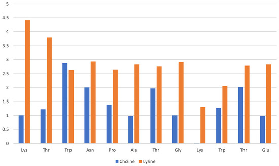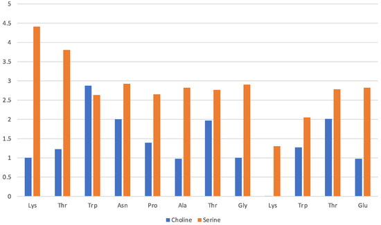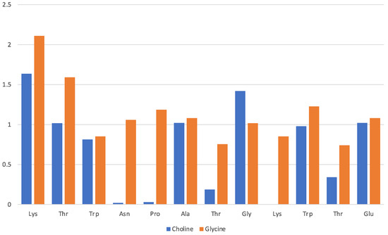 Among the various attempts, the most promising category of biocompatible ILs is likely to be found among the so-called protic ILs [10], which are essentially the result of an acid-base reaction (albeit sometimes only formally) where the proton transfer generates the charge separated species—a protonated base and a deprotonated acid. More specifically, it is possible to obtain a vast class of biocompatible ILs by coupling the cholinium cation with various forms of organic acids and amino acids [11,12,13]. ILs based on cholinium and a deprotonated amino acid ([Ch][AA] ILs) are biocompatible [14,15,16,17,18,19] and easy to synthesize from inexpensive ingredients [20].