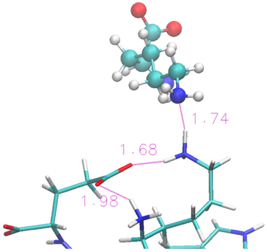 Zoom of terminal residues of oligopeptide in [Ch][Lys]. Proton-acceptor distances are indicated to highlight the intra-protein H-bonds and an occurrence with lysinate ion of IL.