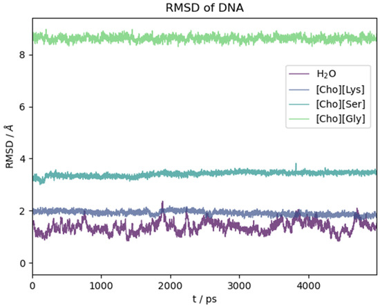 The ds-oligonucleotide behaviour in the water and the three ILs is illustrated in Figure 9. There, we report the RMSD(t) as a function of time along the initial five nanoseconds of simulation common to all simulations. Again, in this case, the reported time section is representative of the equilibrated system. As for the peptide, the structural change with respect to the initial (crystallographic) geometry takes place in the very first few ps of simulation as soon as the constraints on the biomolecule are removed. Then, it reaches a plateau. Contrary to what we have seen for the oligopeptide, water in this case is the solvent that mostly preserves the crystal structure, while the ILs have a pronounced effect on it depending on the anion identity. Lysinate behaves similarly to water in preserving the overall structural features of the DNA complex. Serinate significantly alters the structure, and glycinate has a dramatic effect with an almost complete disruption of the double helix.