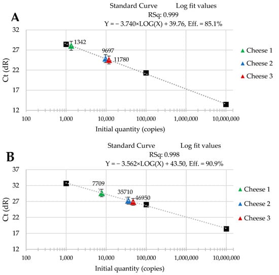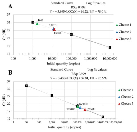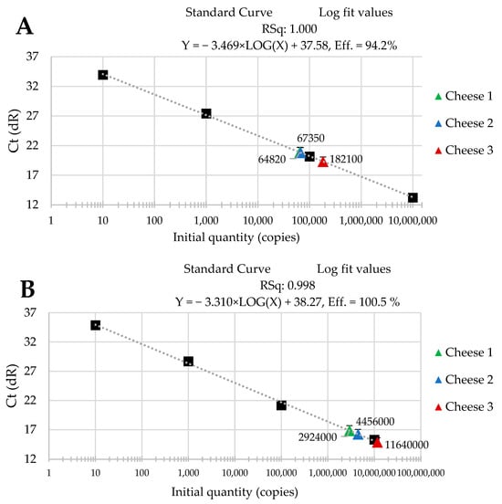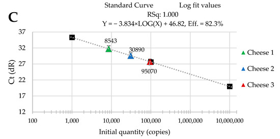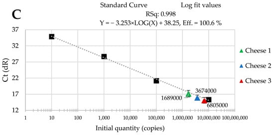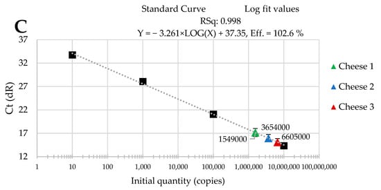 Three batches of cheese produced from raw cow’s milk were examined to evaluate the usefulness of qPCR method for the enumeration of L. delbrueckii subsp. bulgaricus, S. thermophilus, and L. lactis subsp. cremoris. Cheese samples were analyzed immediately after cheese production and after three- and six-month ripening periods. Three qPCR protocols targeting specific genes were designed for the enumeration of L. delbrueckii subsp. bulgaricus, S. thermophilus, and L. lactis subsp. cremoris cells. New sets of primers/probe were developed, and their specificity was validated. The qPCR assays showed a high quantification capacity characterized by their linearity (R2 > 0.998) and PCR efficiencies were within the range 82.3–90.9% for L. delbrueckii subsp. bulgaricus (Figure 1A–C), 94.2–102.6% for S. thermophilus (Figure 2A–C), and 78.0–100.6% for L. lactis subsp. cremoris (Figure 3A–C). A properly designed assay, in the absence of interfering substances in the sample matrix, amplifies target DNA with at least 90% efficiency. In some reactions, the efficiency of the qPCR protocols was 85.1% (Figure 1A), 82.3 (Figure 1C), and 78% (Figure 3A). We isolated DNA from three different cheese batches. Cheese is a very difficult food matrix for DNA isolation due to its high fat content and high calcium ion content, which can inhibit the efficiency of the qPCR. This is probably the reason for the lower efficiency of qPCR in the three samples tested. In the remaining samples, qPCR efficiency was high and exceeded 90%.