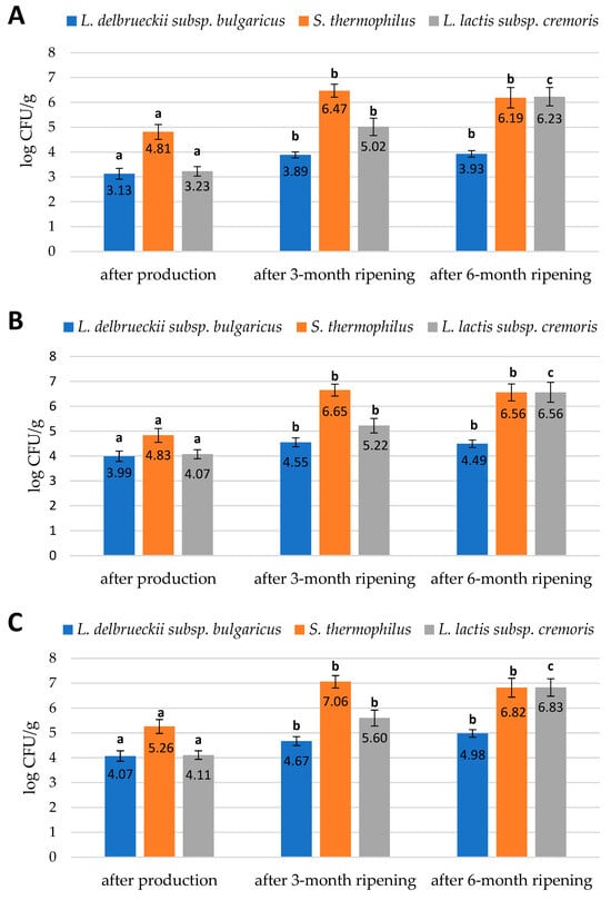 Numbers of L. delbrueckii subsp. bulgaricus, S. thermophilus, and L. lactis subsp. cremoris cells in (A) the first batch of cheese; (B) the second batch of cheese; (C) the third batch of cheese; expressed in log CFU/g obtained by qPCR method. The bars of the same color marked with different letters are significantly different (p < 0.05).
