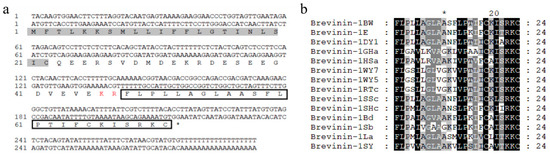 Sequence characterization of Brevinin-1BW. (a) cDNA and predicted amino acid sequence of Brevinin-1BW. The signal peptide is marked with a gray background, the KR protease cleavage site is marked in red font, the mature peptide sequence is boxed, and the stop codon is indicated by an asterisk (*). (b) Amino acid sequence comparison of mature short peptide Brevinin-1BW with different Brevinin-1 family peptides; highly conserved amino acid residues are indicated by the black background.