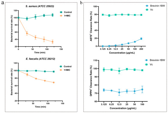 To evaluate the efficiency of the antibacterial function of Brevinin-1BW, the bactericidal rate of Brevinin-1BW against the strains was assessed with the time-killing curve. Both S. aureus and E. faecalis were selected as indicator strains according to the MIC of the Brevinin-1BW AMP; the results are shown in Figure 3a. The bactericidal efficiency of Brevinin-1BW was smooth, killing 67% of S. aureus. Approximately 32% of E. faecalis were killed after 120 min, and this effect was prolonged such that the growth of colonies did not resume over time. No significant change in bacterial growth was observed in the blank control group.