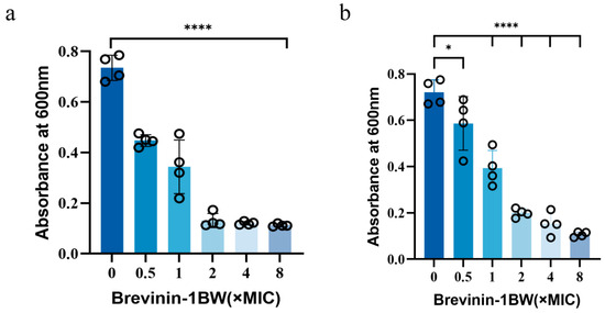 Effect of Brevinin-1BW on S. aureus biofilms. (a) Biofilm inhibitory activity of Brevinin-1BW. (b) Biofilm scavenging activity of Brevinin-1BW. Data represent mean SD values of three independent experiments performed in quadruplicate. The circle represents each experimental data. **** (p < 0.0001), * (p < 0.005).