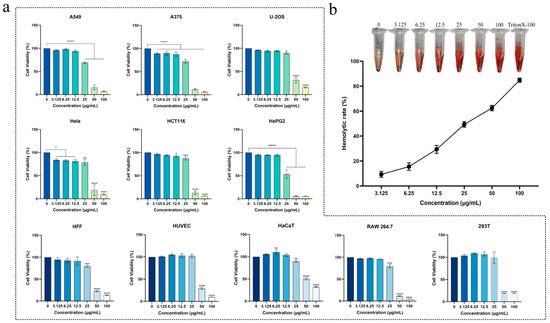 Cytotoxic and hemolytic activity of Brevinin-1BW. (a) Effect of Brevinin-1BW on the viability of six cancer cells and five non-cancer cells. (b) Hemolytic activity of different concentrations of Brevinin-1BW. **** (p < 0.0001), *** (p < 0.001), ** (p < 0.001), * (p < 0.005).