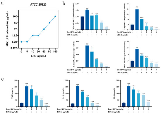 Effect of Brevinin-1BW on the secretion of inflammatory factors in the LPS-induced inflammation model of RAW 264.7 cells. (a) Effect of LPS on Brevinin-1BW inhibition of S. aureus. (b) Effect of Brevinin-1BW on the expression of TNF-α, IL-1β, IL-6, and iNOS mRNA with real-time PCR. (c) Analysis of TNF-α, IL-1β, and IL-6 in cell supernatants by ELISA. ### Indicating differences from unprocessed groups, ### (p < 0.001). * Represent the differences between the model group and the experimental group **** (p < 0.0001), *** (p < 0.001), * (p < 0.005), ns indicates no significant difference.