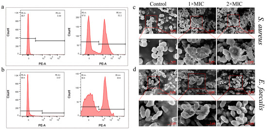 Disruption of S. aureus and E. faecalis cell membranes by Brevinin-BW analyzed with flow cytometry and SEM. (a) S. aureus control (left) and treated with 1 × MIC of Brevinin-1BW at room temperature for 2 h (right). (b) E. faecalis control (left) and treated with 1 × MIC of Brevinin-1BW at room temperature for 2 h (right). (c) SEM analysis of S. aureus treated with 1 × MIC and 2 × MIC Brevinin-1BW. (d) SEM analysis of E. faecalis treated with 1 × MIC and 2 × MIC Brevinin-1BW.