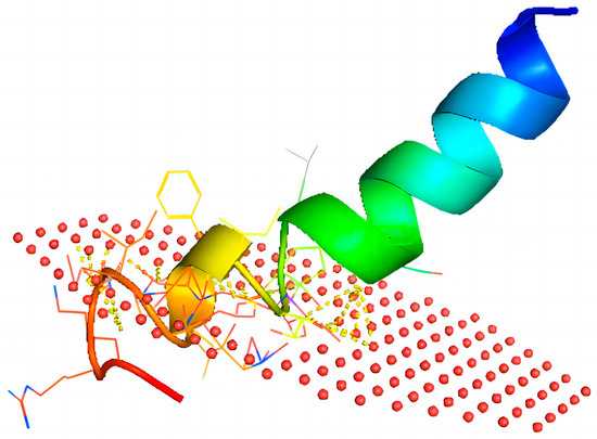 Predicted model for the interaction of Brevinin-1BW with bacterial membranes. Predicted interaction map of Brevinin-1BW with the model membrane (red spheres) generated using the PPM web server, and the results are visualized in PyMOL 2.5 (Schrödinger Inc., CA, USA).