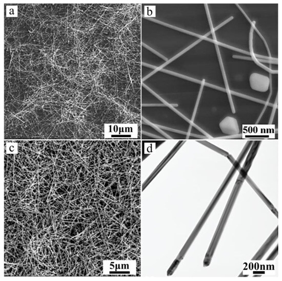 Figure 2 shows the scanning electron microscopy (SEM) and transmission electron microscopy (TEM) images [37,38,39,40] of the Ag nanowires [10,25,26]. Figure 2a shows the overall morphology of the Ag nanowires with lengths of up to tens of micrometers. Figure 2b shows the magnified image of the morphology of Ag nanowires, with average diameters of 80–120 nm. A small amount (<10%) of nanoparticles was also found, which can be separated via stepwise centrifugation method [11,15,16,17,18] (Figure 2c,d). Figure 2c shows the typical SEM image of the separated Ag nanowires with diameters of 80–120 nm and lengths up to tens of micrometers. The crystal structures of these Ag nanowires were further investigated via TEM. This result is similar to the Ag nanowires generated via the polyol-directed synthesis in the presence of PVP [15,16,17,18,21].