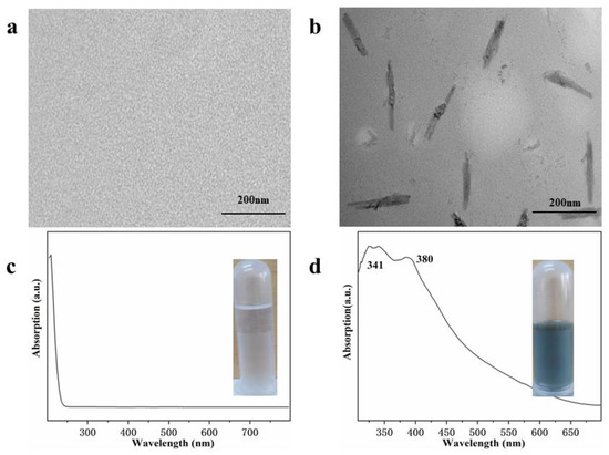 TEM and UV-vis spectra of samples obtained in the absence of PVP (a,c) and sulfamic acid (b,d) under same hydrothermal conditions. The inset is the photographs.