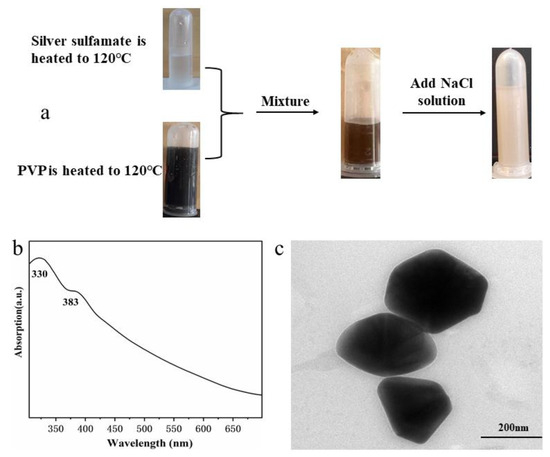 (a) Reaction of preheated Ag sulfamate and preheated PVP aqueous solutions, followed by the addition of NaCl, to which yielded large amounts of free Ag+. UV-vis spectra (b) and TEM image (c) of the mixed solutions.