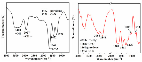 FTIR spectra of PVP obtained from reaction solution before (left) and after (right) hydrothermal treatment.