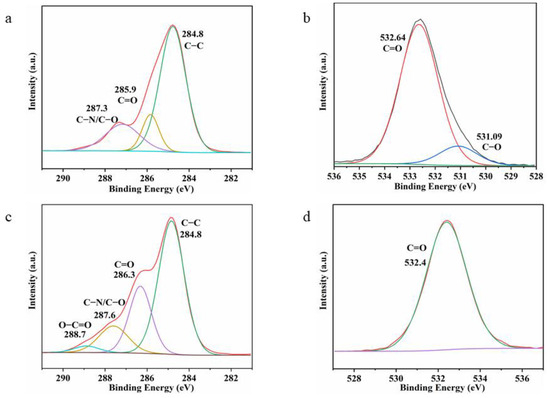 XPS spectra of PVP aqueous solutions before (a,b) and after (c,d) hydrothermal treatment.