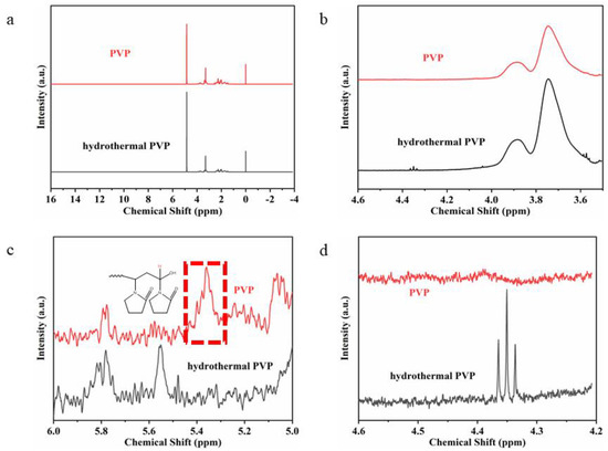 1H NMR spectra of pure PVP and reaction product with different magnifications. (a) from −4 to 16.; (b) from 3.6 to 4.6; (c) from 5 to 6; (d) from 4.2 to 4.6.