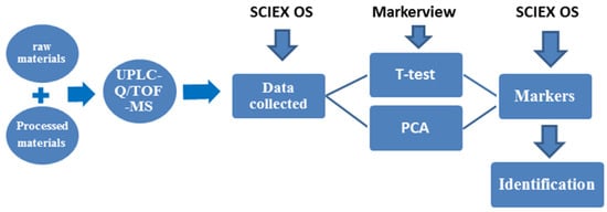 Commonly used analytical methods for plant extract include nuclear magnetic resonance (NMR) [12], gas chromatography (GC) [13], and liquid chromatography (LC) [14]. LC is the most widely used method owing to its various detectors, while NMR is not suitable for trace amounts of gradients, and GC requires tedious derivatization [15]. Liquid chromatography-mass spectrometry (LC–MS) is a powerful analytical technique used for the separation, identification, and quantification of both unknown and known compounds, as well as to elucidate the structure and chemical properties of different molecules. It is very useful for analyzing small molecules and offers higher sensitivity and selectivity in the trace analysis of multicomponent-containing substances. Therefore, it has wide usage in chemical component analysis for complicated plant extracts. In the present study, an efficient and sensitive method has been developed by UPLC-QTOF-MS. Additionally, the chemical constituents of fresh and processed rhizomes of P. cyrtonema have been comprehensively profiled. Moreover, the metabolomics approach was utilized to analyze the variation of chemical constituents during the preparation process. We successfully discriminate the ten kinds of P. cyrtonema, including the raw material and the processed herbs, by establishing corresponding chemical markers for each of them. These findings offer a material foundation for the quality control of P-PCHs.