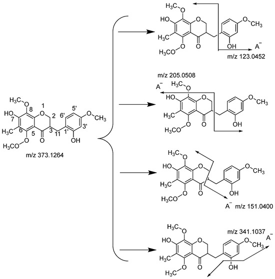 The compound possessing m/z 373.1264 was identified as Ophiopogonanone F [23] (Figure 4). According to the fragmental patterns of flavonoids, two methoxyls were probably located at the C-5 and C-8 positions, for which the A ring fragmentation was prohibited and no A ring fragment was observed. The product ion spectra giving a base peak at m/z 151.0400 might indicate that the cleavage of C-2 and C-3 bonds was the most prominent fragmentation pathway in which the charge was retained on the A−. Then, the fragment ion at m/z 205.0508 resulted from the cleavage of the C-3 bond and the loss of methoxyl in the C-8 position. Another product ion at m/z 123.0452 was produced by the cleavage of the C-11 bond, with the charge on the C ring. Uncommonly, the fragments at m/z 341.1037 were observed, owing to the cleavage of the C-7 and C-2 bonds, and the charge was retained on the A−.