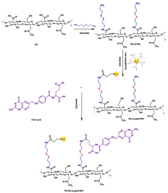 Achieving successful targeted cancer therapy remains a significant challenge. Therefore, numerous researchers have employed dual-targeted therapies as ideal treatments. This dual receptor targeting mechanism enables the precise and effective delivery of NPs to tumor cells, maximizing their therapeutic outcome while being blind to normal cells [27]. In this regard, to further enhance the targeted drug delivery efficacy of HA, we added folic acid (FA), known as vitamin B9, which is renowned for its biocompatibility, ensuring safety for normal cells while acting as a critical agent in folate receptor (FR)-targeted cancer treatments [28,29,30]. Historically, FRs were among the first to be recognized as legitimate targets for cancer therapy due to their high abundance on the surface of various cancer cells and low expression in healthy tissues [31]. Utilizing this cancer cell uptake specificity, we designed a redox-responsive hybrid system with a disulfide reducible bond (HA-ss-gold NPs), further modified with FA to achieve FA-HA-ss-gold NPs, as shown in Figure 1.