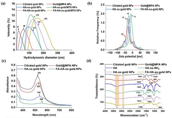 For FA-HA-ss-gold NP synthesis, FA was first activated by EDC/NHS and then conjugated into HA-ss-gold NPs through an amidation reaction. The synthetic scheme is shown in Figure 1 and Scheme 2. Changes in hydrodynamic diameter throughout synthesis indicate nanoparticle structural dynamics. After coating gold NPs with MPA, the initial increase in size from 21 nm to 48 nm suggests successful surface functionalization. As a result of the subsequent attachment of HA, a substantial size increase to 112 nm occurs, primarily due to the long-chain nature of HA. As a result of encapsulating MTX in HA-ss-gold NPs, the hydrodynamic diameter increased to 133 nm. After FA conjugation to HA-ss-gold NPs, the size increased further to 141 nm and 162 nm after MTX encapsulation into FA-HA-ss-gold NPs (Figure 2a). From the zeta potential measurements (Figure 2b), the significant shift of the NPs from −31 mV to −15 mV after modification with HA confirmed successful polymer conjugation. The same negative zeta potential at all synthesis stages indicated the overall stability of the NPs in preventing particle aggregation in physiological environments, ensuring easy re-dispersion [38,39]. The reason for FA-HA-ss-gold NPs becoming less negatively charged (−8 mV) was that the more negatively charged carboxyl acid moieties (COO−) of HA present on the surface of the HA-ss-gold NPs were replaced by FA [40,41]. The optical properties of the nanoparticles were characterized by UV–vis spectroscopy, demonstrating that the gold NPs exhibited an ultraviolet absorption peak at 520 nm before and absorption at 530 nm after modification with MPA (Figure 2c). The absorption band was shifted to 560 nm in the final product FA-HA-ss-gold NPs.