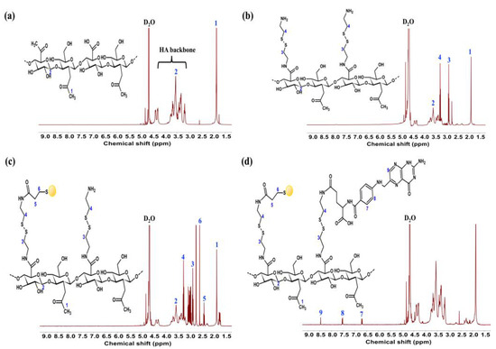 1HNMR spectrum characterization of (a) HA in D2O, (b) HA-cystamine (HA-ss-NH2), (c) HA-ss-gold NPs, and (d) FA-HA-ss-gold NPs.