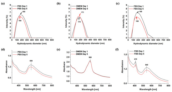 Stability investigation of FA-HA-ss-gold/MTX NPs in PBS, DMEM, and FBS by DLS: (a) Day 1 = 168 nm, Day 5 = 164 nm; (b) Day 1 = 174 nm, Day 5 = 171 nm; (c) Day 1 = 169 nm, Day 5 = 166 nm and by UV–vis spectroscopy: (d) 550 nm at Day 1 and Day 5; (e) 560 nm at Day 1 and Day 5; and (f) two peaks of 410 nm and 540 nm at both Day 1 and Day 5.
