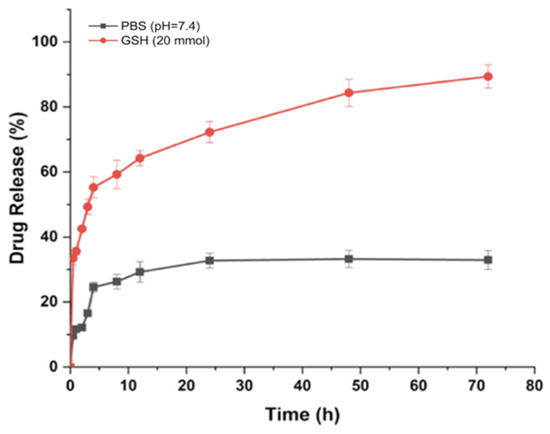 The MTX release from the NPs was analyzed in PBS (pH 7.4) and 20 mmol GSH solutions as simulated physiological and tumor environments, respectively. The MTX release profiles in the PBS solution from MTX-loaded NPs are shown in Figure 5. The MTX-loaded NPs exhibit a rapid initial release of MTX in the PBS (pH 7.4) solution, which is about 31% after 24 h. In the following 72 h, they displayed a suppressed release in the physiological medium. In contrast, the release of MTX kept increasing in the reducing environment. This result can be explained by the fact that reactive GSH attacks the disulfide bond to generate thiols. This reduction reaction leads to a breakdown of the disulfide bond, allowing for the release of MTX from FA-HA-ss-gold NPs. After 72 h, approximately 86% of encapsulated MTX were released in a sustained manner.
