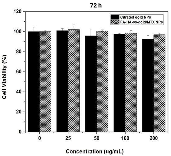 To assess the cytotoxicity of FA-HA-ss-gold and HA-ss-gold NPs, WST-1 assays were performed on HeLa and BT-20 cells, and the results were compared with the free MTX group. In Figure 7, at doses greater than 100 µg/mL, FA-HA-ss-gold/MTX NPs showed a noticeable decrease of both HeLa and BT-20 cells during 24 h. Simultaneously, cells that were exposed to free MTX displayed decreased viability at every tested concentration. Citrated gold NPs alone exerted negligible cytotoxic effects, whereas HA-ss-gold/MTX NPs induced detectable cytotoxicity inferior to that of FA-HA-ss-gold/MTX NPs. The cytotoxicity effects of FA-HA-ss-gold/MTX NPs were more pronounced at the 48 h and 72 h marks, particularly at higher doses in contrast to citrated gold NPs and HA-ss-gold/MTX NPs. Moreover, a significant inhibition in the proliferation of HeLa cells at 72 h was observed upon FA-HA-ss-gold NP treatment with an IC50 value of 126.7 μg/mL, and 55.5 μg/mL for free MTX treatment. We also observed that FA-HA-ss-gold NPs caused a significant decrease in the proliferation of BT-20 cells (IC50 = 180.8 μg/mL) while free MTX was 126.7 μg/mL.