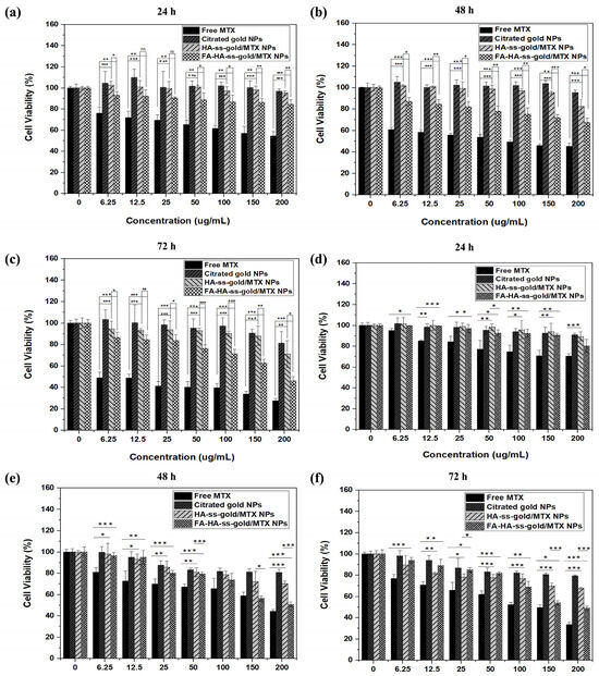 Anti-cancer assessment on HeLa cells at (a) 24 h, (b) 48 h, (c) 72 h, and BT-20 cells at (d) 24 h, (e) 48 h, and (f) 72 h treated with free MTX, citrated gold, HA-ss-gold/MTX, and FA-HA-ss-gold/MTX NPs. (p-value, * p < 0.05, ** p < 0.001, and *** p ≤ 0.0001).