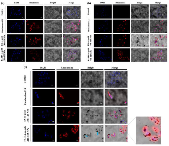 Cellular uptake and intracellular localization analysis of FA-HA-ss-gold NPs at (a) 3 h, (b) 6 h, and (c) 24 h with DAPI (blue), Rhodamine (Red), and the bright field. FA-HA-ss-gold NPs show the highest Rh-123 fluorescence at 24 h compared to HA-ss-gold NPs. The blue arrows show the localization of gold NPs (black dots) in the tumor. Efficiently internalized gold NPs are more observable, and most of them are found located inside the nucleus, demonstrating and proving the hierarchy of the dual-target effects of the added folic acid to HA-ss-gold NPs. This high internalization positions the FA-HA-ss-gold/MTX NPs at the frontline of biodegradable hybrid nanoparticles with multifunctional therapeutic capabilities. The scale bar is 20 μm.
