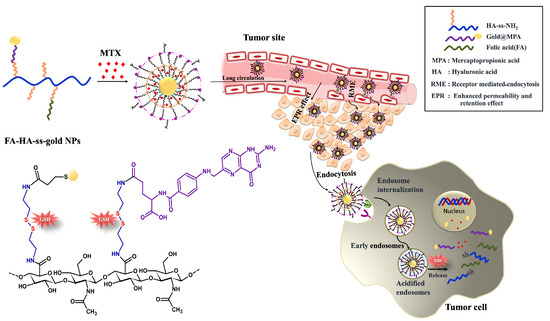 The further conjugation of folic acid to the HA-ss-gold NPs could achieve dual active targeting. After that, MTX was successfully encapsulated by FA-HA-ss-gold NP through hydrophobic–hydrophobic interactions (Scheme 2). The EE and the drug-loading capacities (LC) of MTX-loaded FA-HA-ss-gold NPs were evaluated, and the MTX release from the NPs in a reduction environment was investigated. A WST-1 assay was performed to evaluate the anti-tumor efficacy of MTX-loaded NPs on HeLa and BT-20 cells. The cellular uptake was studied in HeLa cells and determined using fluorescence microscopy.