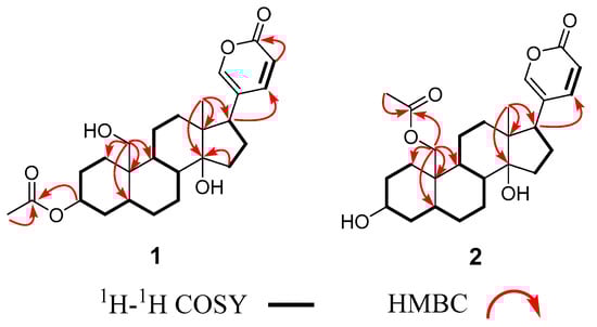 1H–1H COSY and key HMBC correlations of compounds 1 and 2. Bold lines indicate the 1H-1H coupling, and arrows indicated 1H/13C long-range correlations.