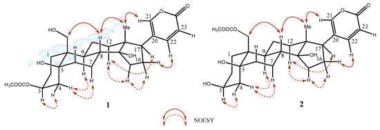 The key NOESY correlations of compounds 1 and 2. Solid arrows indicate correlations in the β-orientation, and dashed arrows show correlations in the α-orientation.