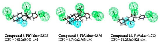 Common feature pharmacophore models. The IC50 values and FitValues for Bufalin (5), bufotalin (8), and bufalin-lactam (15) are presented. The green represents the hydrogen bond acceptors, and the blue represents the hydrophobic centers.