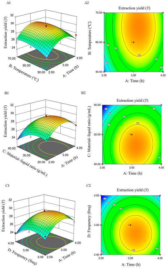 Interaction effect of each factor on the extraction yield Y from RTDP. (A) Effect of time and temperature on the extraction yield of RTDP (A1 The 3D surface of the intersection of time and temperature; A2 The contour of the intersection of time and temperature); (B) effect of time and material–liquid ratio on the extraction yield of RTDP (B1 The 3D surface of the intersection of time and material–liquid ratio; B2 The contour of the intersection of time and material–liquid ratio); (C) effect of time and frequency on the extraction yield of RTDP (C1 The 3D surface of the intersection of time and frequency; C2 The contour of the intersection of time and frequency); (D) effect of temperature and material–liquid ratio on the extraction yield of RTDP (D1 The 3D surface of the intersection of temperature and material–liquid ratio; D2 The contour of the intersection of temperature and material–liquid ratio); (E) effect of temperature and frequency on the extraction yield of RTDP (E1 The 3D surface of the intersection of temperature and frequency; E2 The contour of the intersection of temperature and frequencye); (F) effect of material–liquid ratio and frequency on the extraction yield of RTDP (F1 The 3D surface of the intersection of material–liquid ratio and frequency; F2 The contour of the intersection of material–liquid ratio and frequency).