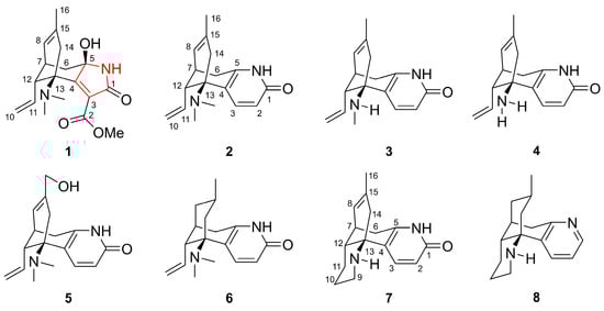 The following supporting information can be downloaded at: https://www.mdpi.com/article/10.3390/molecules29071581/s1: Figures S1–S10: 1D and 2D NMR, UV, IR, HREIMS, and HPLC spectra of compound 1; Figures S11–S24: 1D NMR spectra of compounds 2–8; Tables S1–S8: Detailed NMR parameters of compounds 1–8.