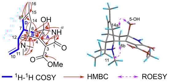 The planar structure of 1 was determined through 2D NMR correlations (Figure 2). The 1H−1H COSY correlations identified a single spin system as follows: H2-10/H-11/H-12/H-7(H-6b)/H-8. The HMBC correlations from N-Me(a) to C-13 and N-Me(b) and from N-Me(b) to C-13 demonstrated their linkage via the Nβ atom. The HMBC cross-peaks from H-11 to C-13, from H-12 to C-13 and C-4, from H-6a to C-5 and C-4, and from H-6b to C-5, along with the 1H−1H COSY correlations of H-12/H-7/H-6b, constructed the ring B. The monosubstituted Δ10(11) double bond was connected to ring B through C-12, as revealed by the 1H−1H COSY cross-peaks of H2-10/H-11/H-12. The ring D was established by the HMBC cross-peaks from H3-16 to C-15, C-14, and C-8, and from H2-14 to C-13 and C-4, together with the 1H−1H COSY cross-peaks of H-12/H-7/H-8. The HMBC correlations from 5-OH (δH 5.74) to C-6, C-5, and C-4 and from the NαH proton (δH 8.76) to C-4 and C-5, along with the chemical shift of C-5 (δC 87.0), fixed 5-OH and NαH at C-5, which further confirmed the presence of a carbinolamine moiety. Subsequently, the HMBC correlations from the NαH proton (δH 8.76) to C-1 (δC 166.0), C-3, and C-4 not only indicated the presence of the amide group and Δ3(4) double bond but also constructed the five-membered ring A. The unplaced fragment was attributable to a methyl formate group by the HMBC cross-peak from the OMe (δH 3.66) to C-2 (δC 165.3) and positioned at C-3. Therefore, the planar structure of 1 with a novel 5/6/6 tricyclic skeleton was delineated.