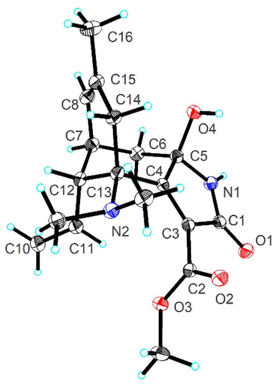 The relative configuration of 1 was elucidated using ROESY analysis (Figure 2). The correlation of H-11/H-6b indicated the β-oriented H-12. The β-orientation of 5-OH was defined via the ROESY correlation of 5-OH/H-14a. Single-crystal X-ray diffraction, employing Cu Kα radiation, conclusively established the structure and determined the absolute configuration as 5R,7R,12R,13R [Flack parameter = −0.02(10)] (Figure 3).
