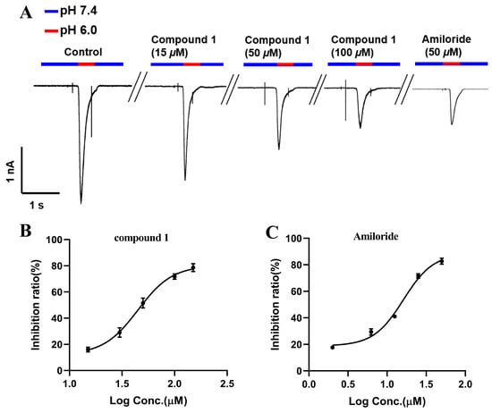 The effects of compounds 1–8 and Amiloride on ASIC1a current. (A) Inhibition ratio of compounds 1–8 (50 µM) and Amiloride (50 µM) on ASIC1a current. The data are presented as the mean ± SD (n ≥ 3). (B) Current ratio of compound 1 (50 µM) and Amiloride (50 µM) on ASIC1a. The data are presented as the mean ± SD (n ≥ 3) and were analyzed by Student’s t-test; *** p < 0.001 vs. control.