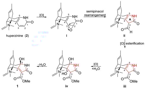Biogenetically, compound 1 is hypothesized to originate from huperzinine (2) [29,30], a co-isolated, well-known Lycopodium alkaloid (Scheme 1). The initial step was the epoxidation [31] of the Δ2(3) double bond of 2 to yield intermediate i. Key semipinacol rearrangement [31,32] in i led to ii with a rearranged five-membered ring A. Finally, oxidation [33] and esterification [33] of the intermediate ii was followed by epoxidation [34], epoxide cleavage [34], dehydration [35], and the formation of 1.