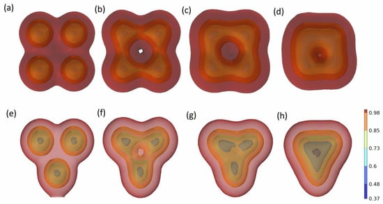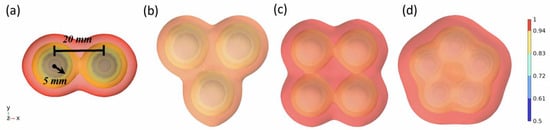 As illustrated in Figure 1, the spherical centers of the oil droplets are formed into equilateral triangles, quadrilaterals, and pentagons with side lengths of 20 mm in order to analyze the effects of the different numbers of oil droplets on the coalescence of the droplets. The radius of the oil droplets is 5 mm, the distance between the oil droplets is 20 mm, the density of the oil droplets is 800 kg/m3, the density of the water phase is 1000 kg/m3, the viscosity of the oil droplets is 3 mPa·s, and the viscosity of the water phase is 0.5 mPa·s. The color code in the figure shows the change in water phase saturation at the position of the liquid film.