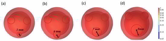 State of oil droplets after coalescing (oil phase volume fraction distribution). (a–d) indicate the coalescence state of the third oil droplet for 3 mm, 6 mm, 7 mm, and 8 mm conditions, respectively.