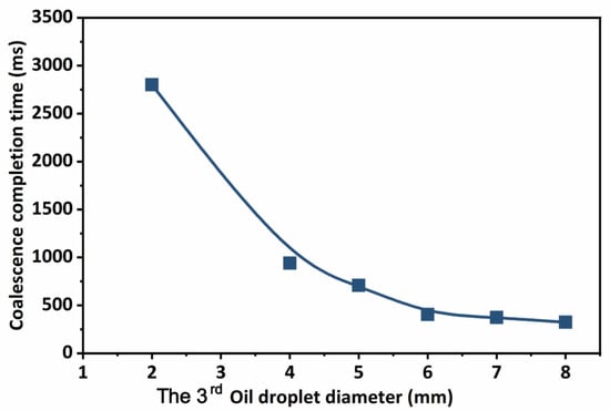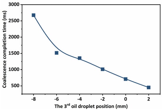 As shown in Figure 8, the oil droplet location has a significant impact on the time it takes to complete coalescence. As the third oil droplet approaches the midpoint of the other two oil droplets, the time for oil droplet coalescence decreases, which can be as low as 400 ms, whereas the time for oil droplet coalescence increases exponentially with the distance between the third oil droplet and the midline of the other two oil droplets, which can be as high as 2500 ms. The coalescence process of oil droplets is actually a simultaneous process of multiple oil droplets, which are attracted to each other due to the fluid interface. In the non-homogeneous phase conditions, the distance between the oil droplets, size, and other factors affect the time of coalescence (for crude oil, the density of fluids is similar, generally in the range of 0.8~0.95 × 103 kg/m3, while the viscosity and density have a certain correlation, the simulation process is relatively complex, so this study focuses on the analysis of the size and distance of oil droplets), so that there is a sequential relationship between their coalescence, which also causes the difference in coalescence time. Therefore, when the emulsion is subjected to oil–water separation, the small oil droplets can be prioritized to form large oil droplets by means of standing, which enhances its ability to coalesce other oil droplets. For emulsions with strong dispersion and high water content, small oil droplets must first complete the coalescence in a small space, and then the large oil droplets that have completed the coalescence enter a larger space to complete further coalescence.