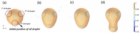 The coalescence process of three oil droplets when the diameter of one oil droplet is 8 mm (oil phase volume fraction distribution). (a–d) indicate the coalescence states at times of 0 ms, 100 ms, 200 ms, and 400 ms, respectively.