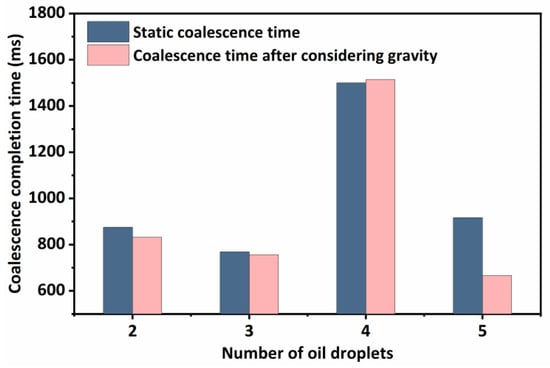 As can be seen in Figure 9, the oil droplets move upward together while coalescing, eventually reaching the top to spread out and stabilize. Overall, this movement does not have an effect on the coalescence time of the oil droplets. In order to verify this idea, the variation of the coalescence completion time for different numbers of oil droplets subjected to gravity is calculated as shown in Figure 10.